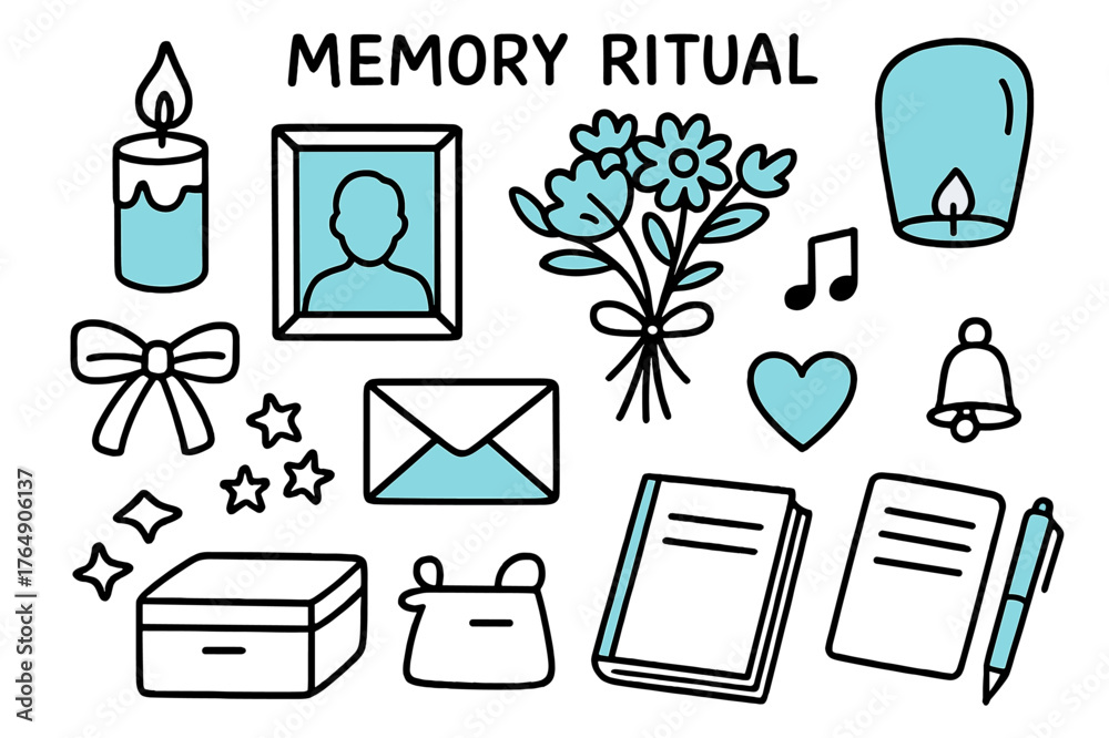 Memory Ritual Icons. // Memory ritual. Hand-drawn doodle illustration Memory ritual [candle (accented), photo frame (accented), bouquet (accented), ribbon, #1764906137