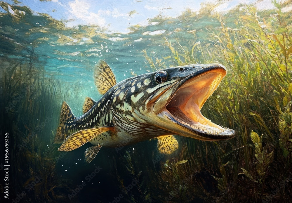 menacing predatory pike lunging through sunlit underwater weeds with jaws wide open and bubbles rising #1956793155