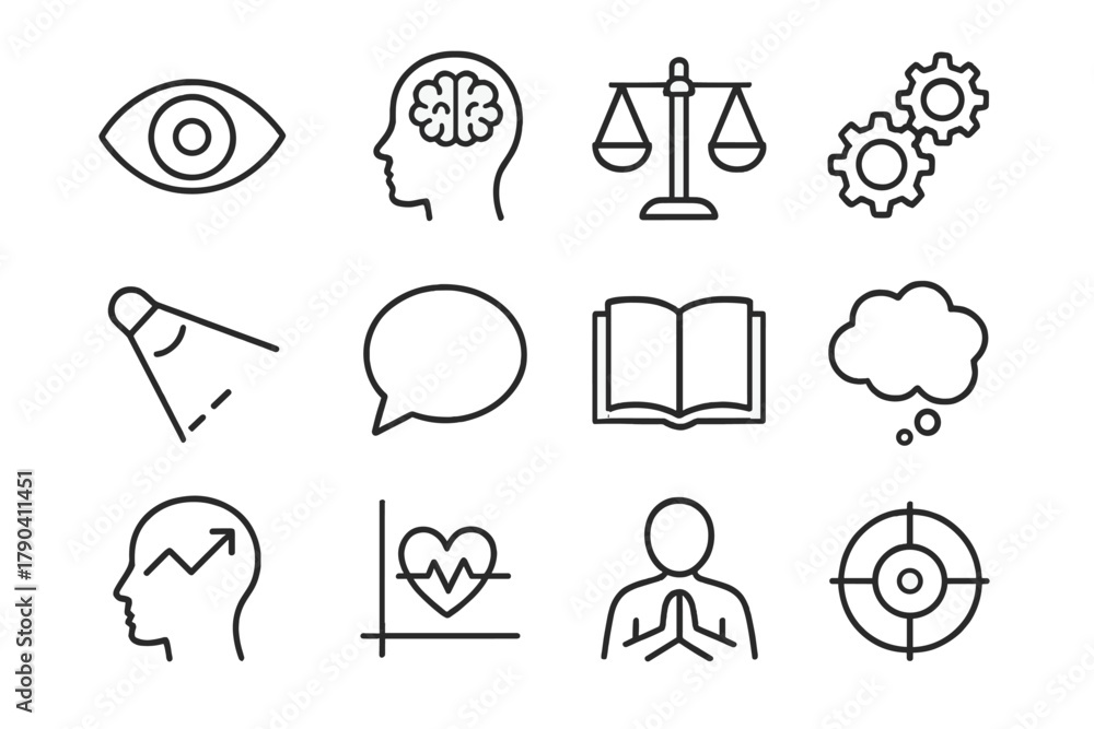 Mental Processes Icons. Line style icons of Mental Processes: perception eye, memory icon, decision scale, reasoning gears; #1790411451