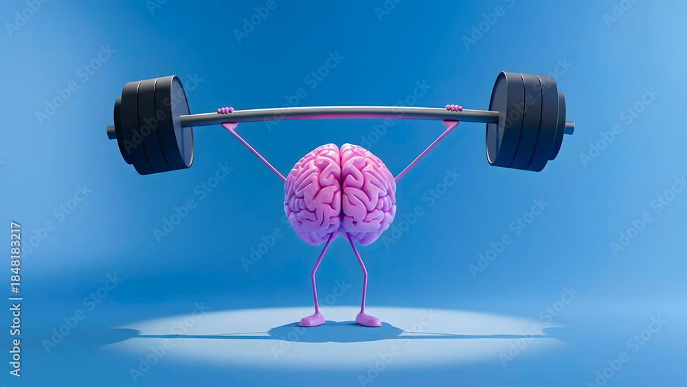 Mental Strength and Brain Training Concept. 3D Cartoon Brain Lifting Heavy Barbell on Blue Background. #1848183217