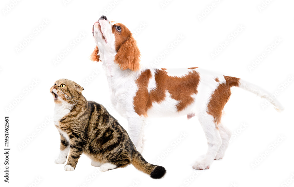 Meowing Scottish Fold cat and curious Spaniel puppy together, looking up, side view, isolated on white background #1951762561