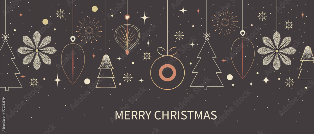 Merry Christmas and Happy New Year card or banner with holiday gold line icons. Luxury dark background with Christmas tree snowflake toys, baubles, stars, bell, ball geometric minimal. Vector design. #1772393579