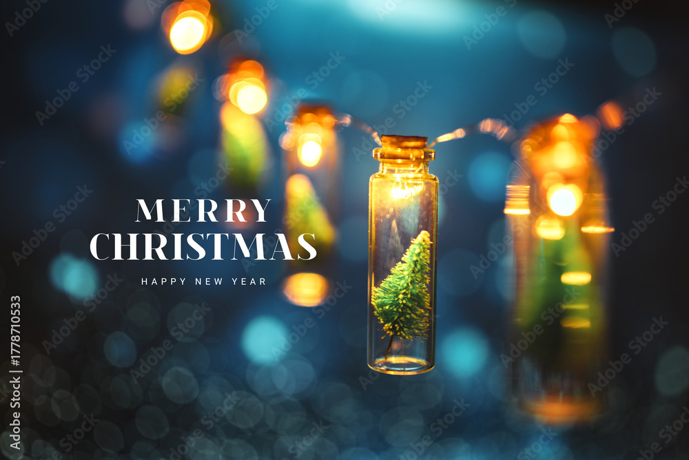 Merry Christmas and Happy New Year greeting card background with mini Christmas tree in glass bottle, glowing lights and bokeh decoration, holiday celebration concept, winter festive season background #1778710533