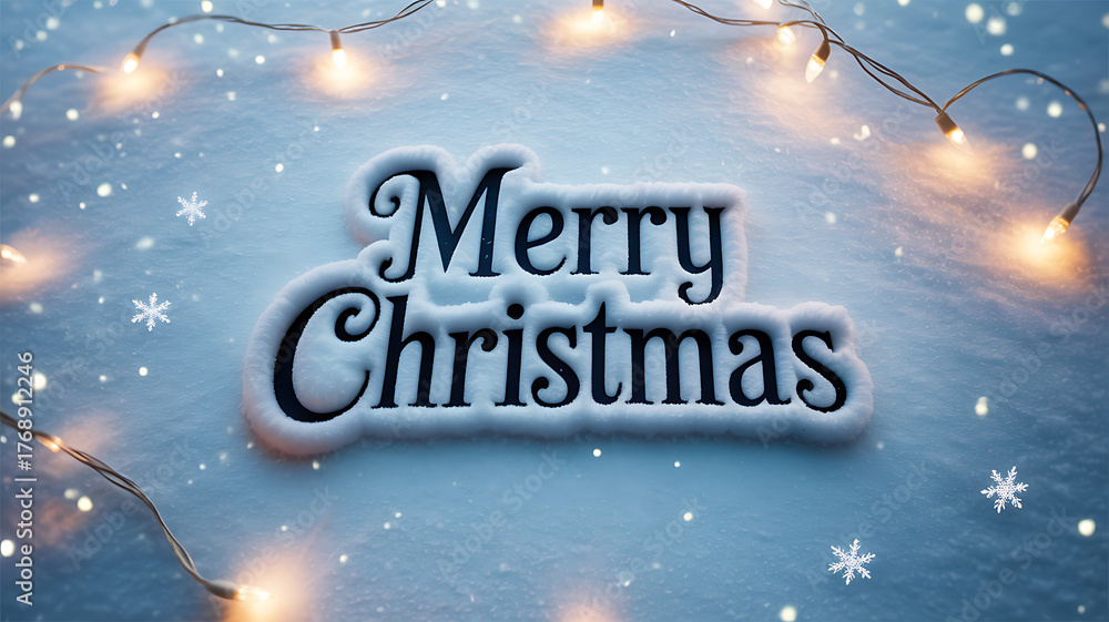 Merry Christmas text on snowy background with string lights and snowflakes #1768912246