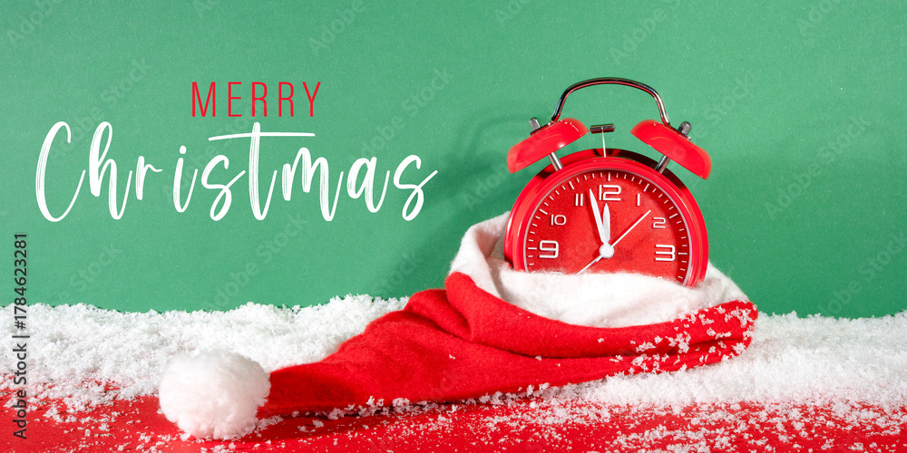 Merry Christmas xmas celebration holiday greeting card long with text - countdown, alarm clock in santa hat on snow, isolated on green background #1784623281
