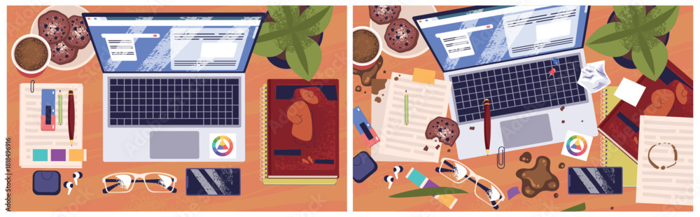 Messy workplace. Dirty and clean desk top view, mess or tidy work table clutter things workflow process organization above computer laptop busy space, classy vector illustration #1818496916