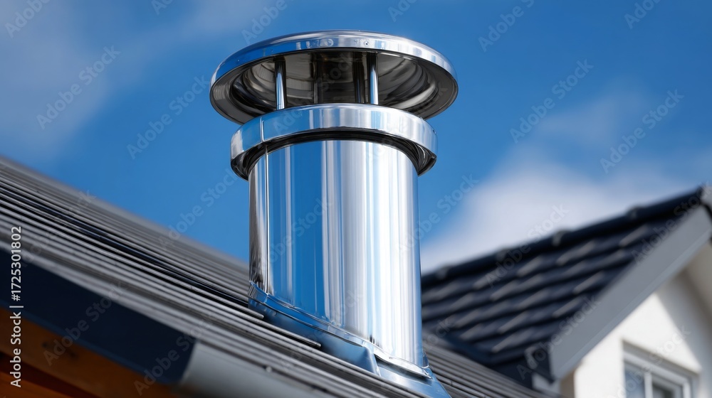 Metal chimney on a residential roof against a clear blue sky during daytime #1725301802