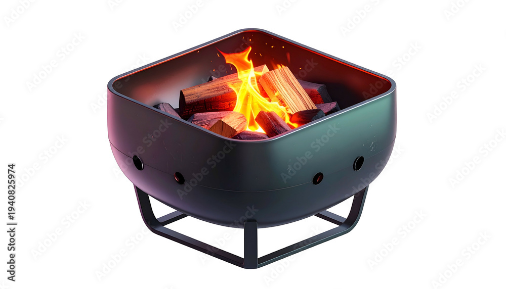 Metal fire pit with burning firewood modern design backyard fire feature outdoor warmth #1940825974