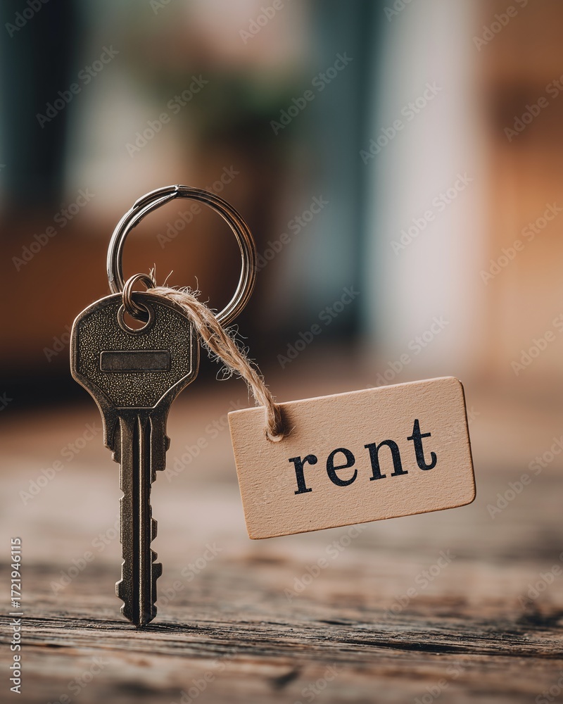 Metal house key with rent tag attached, resting on wooden surface, symbolizes real estate and rental concepts. image conveys sense of home and property management #1721946115
