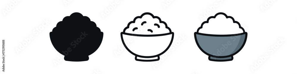 metal rice bowl icon on white background Black silhouette flat icon outline icon and colored icon style. 1x3 grid. three minimal vector icon style #1752901688