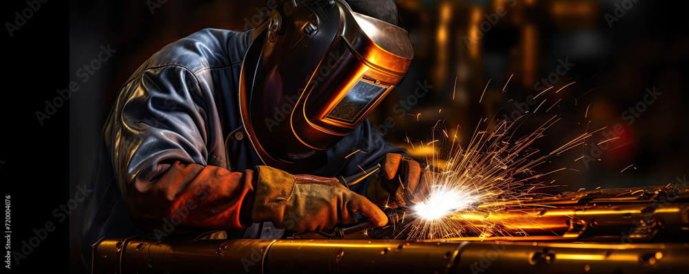 Metal welder working with arc welding machine to weld steel at factory. generative ai #720004076