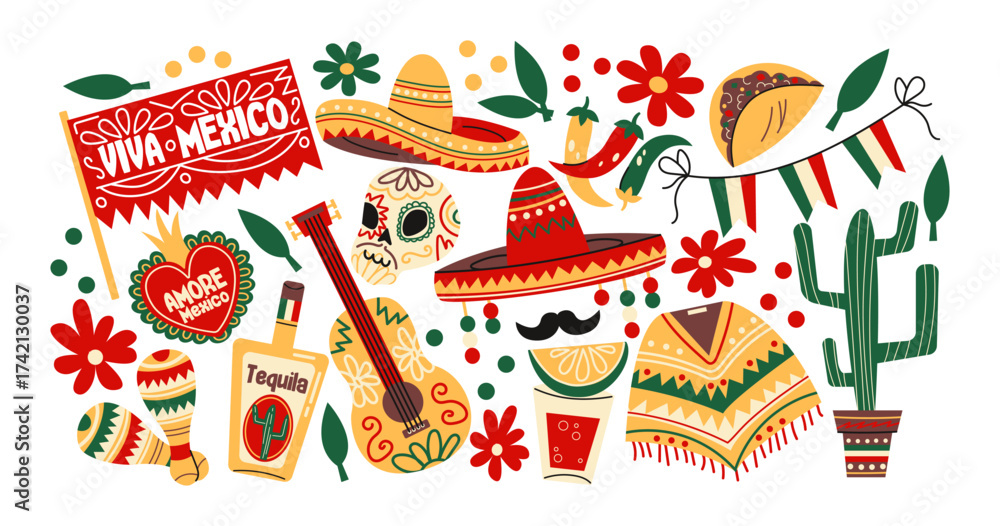 Mexican fiesta stickers in retro cartoon. Traditional holiday set: sombrero, poncho, tequila, guitar, maracas, cactus, chili, flowers. Celebration illustration for Cinco de Mayo, party decor #1742130037