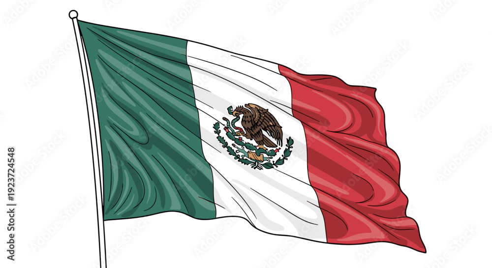 Mexican national flag waving with emblem on green, white, and red stripes #1923724548