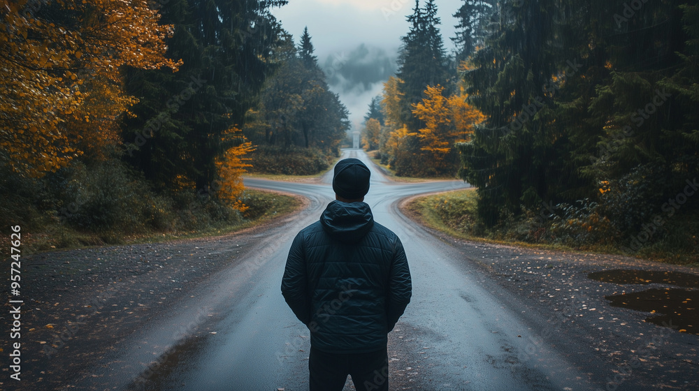 Mężczyzna wybiera między dwiema drogami, biorąc pod uwagę ich wpływ na ochronę środowiska. #957247626