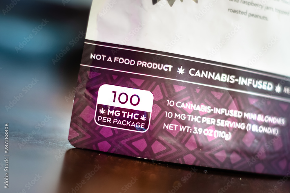 100mg THC dosage warning for a cannabis plant infused edible. Up close on packaging. #287288806