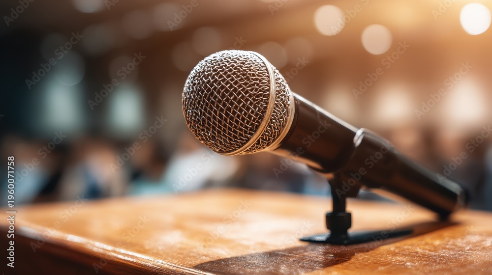 Microphone on podium in a university seminar room with out-of-focus audience #1960071758