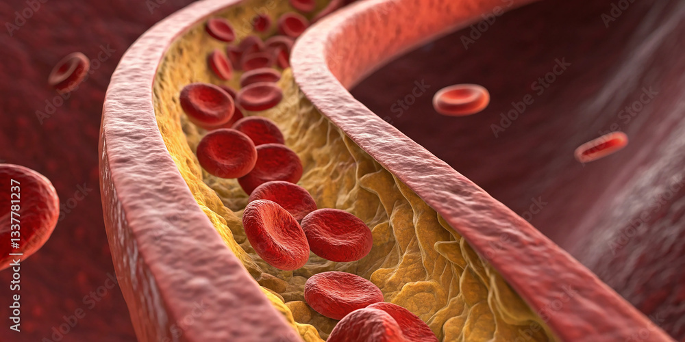 microscopic blood vessels, visceral fat and healthy cholesterol medical media 3d illustration. Lipid metabolism disorder, fat accumulation in bloodstream, 3D medical art #1337781237