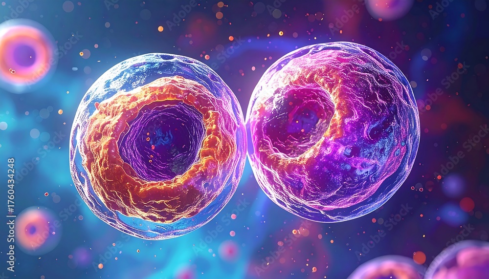 Microscopic illustration depicts cellular division, with two spherical cells in vivid colors. Orange/purple hues showcase intricate internal structures #1760434248