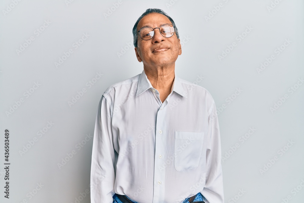 Middle age indian man wearing casual clothes and glasses relaxed with serious expression on face. simple and natural looking at the camera. #436503489