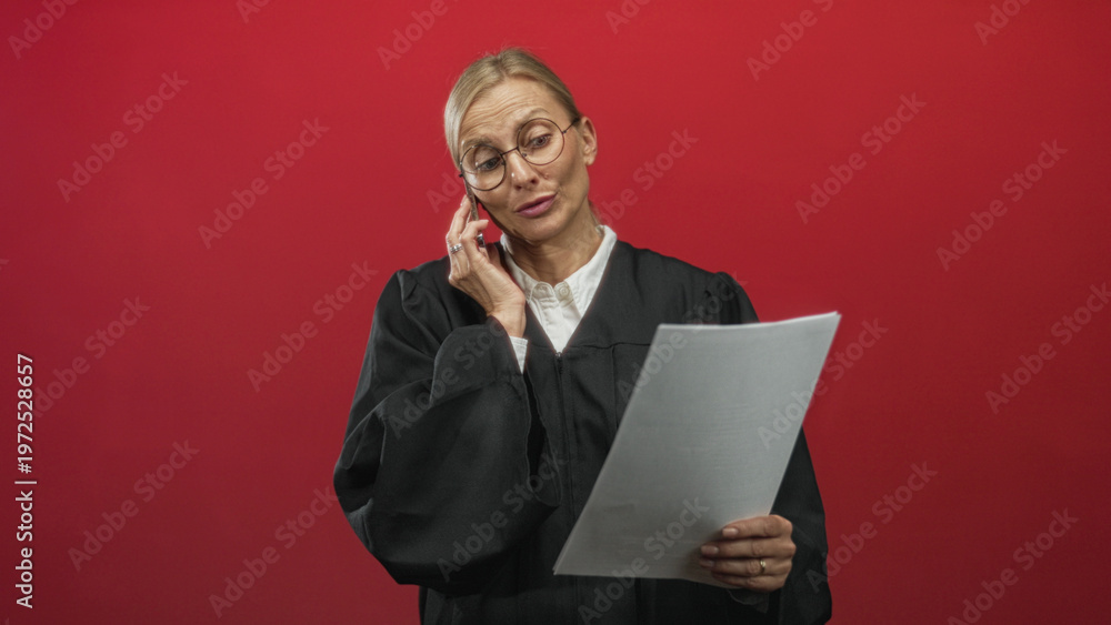 Middle aged blonde woman judge reads a paper while holding a phone to her ear in studio; confident authority. #1972528657