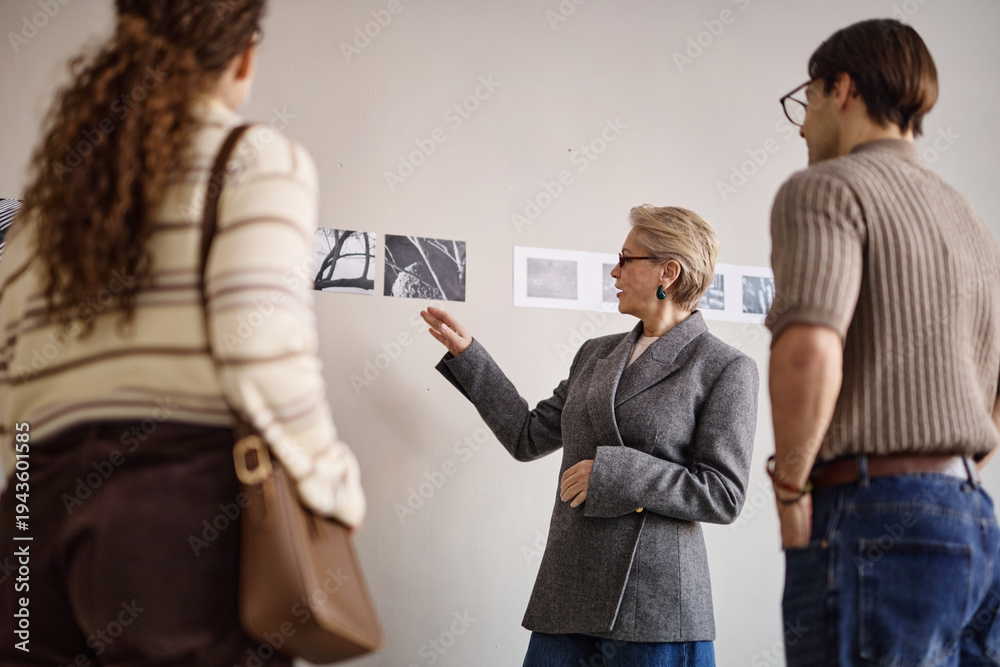 Middle aged Caucasian woman explaining black and white photographs on wall to young adult Caucasian man and woman during art discussion in gallery #1943601585