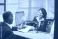 Middle aged Caucasian woman smiling while assisting middle aged Black man submitting documents at visa center reception desk, both engaging in formal application process through glass partition #1911543036