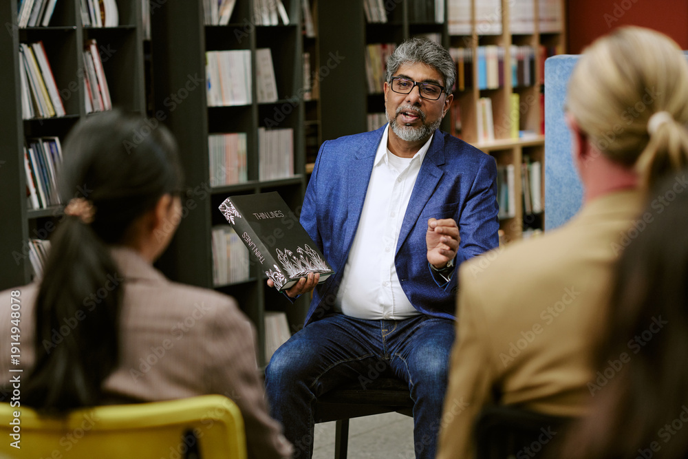 Middle aged man presenting book to diverse group, sitting in library, holding open book with hand raised, engaging audience during educational presentation #1914948078