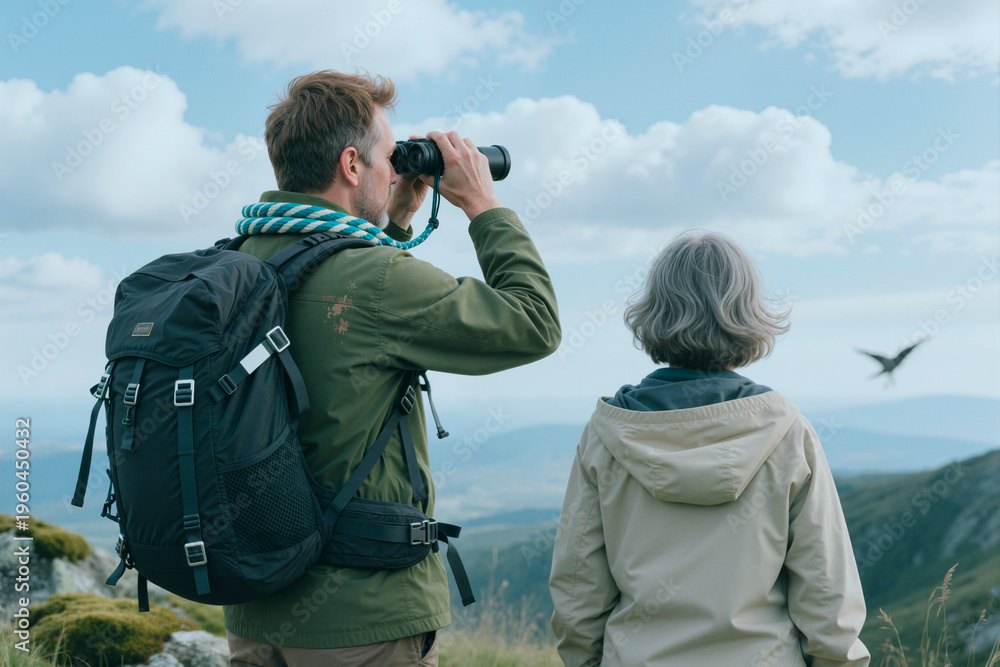 Middle aged man using binoculars beside senior woman while birdwatching on mountain viewpoint, supporting eco tourism and outdoor recreation marketing for travel campaigns #1960450432