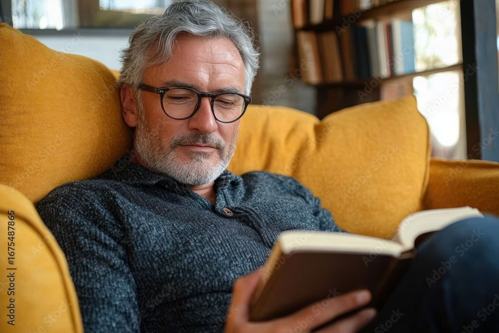 Middle-aged man with gray hair and glasses reading a book comfortably seated on a mustard yellow sofa in a cozy, warmly lit room #1675487865