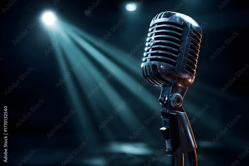 Mikrofon auf Bühne mit mehreren Scheinwerfern im Hintergrund #1770132540