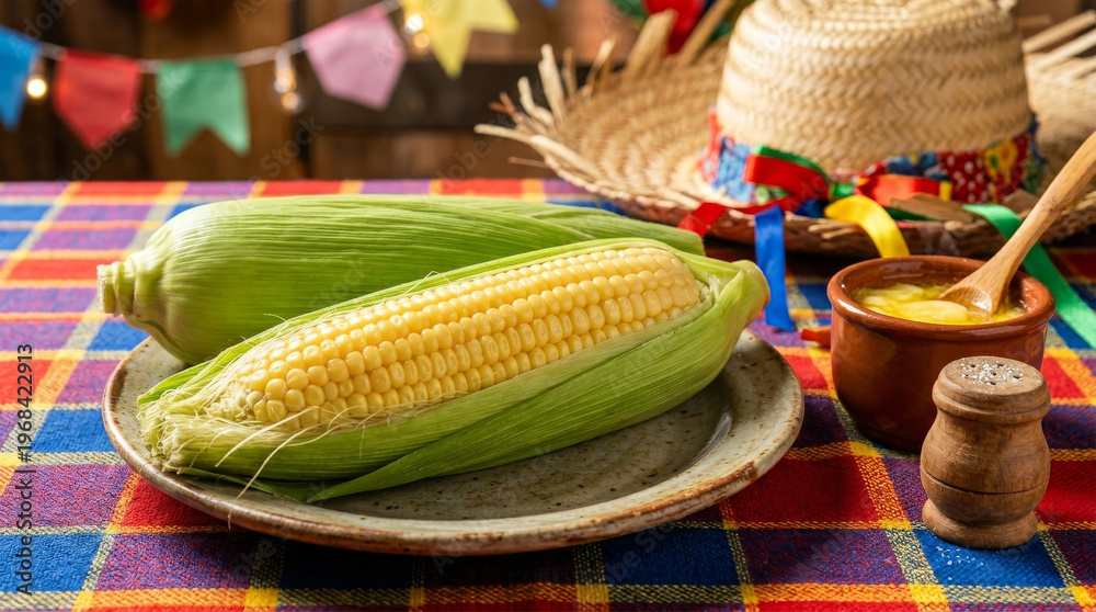 Milho verde cozido com manteiga em mesa temática de Festa Junina com chapéu de palha e bandeirinhas ao fundo #1968422913