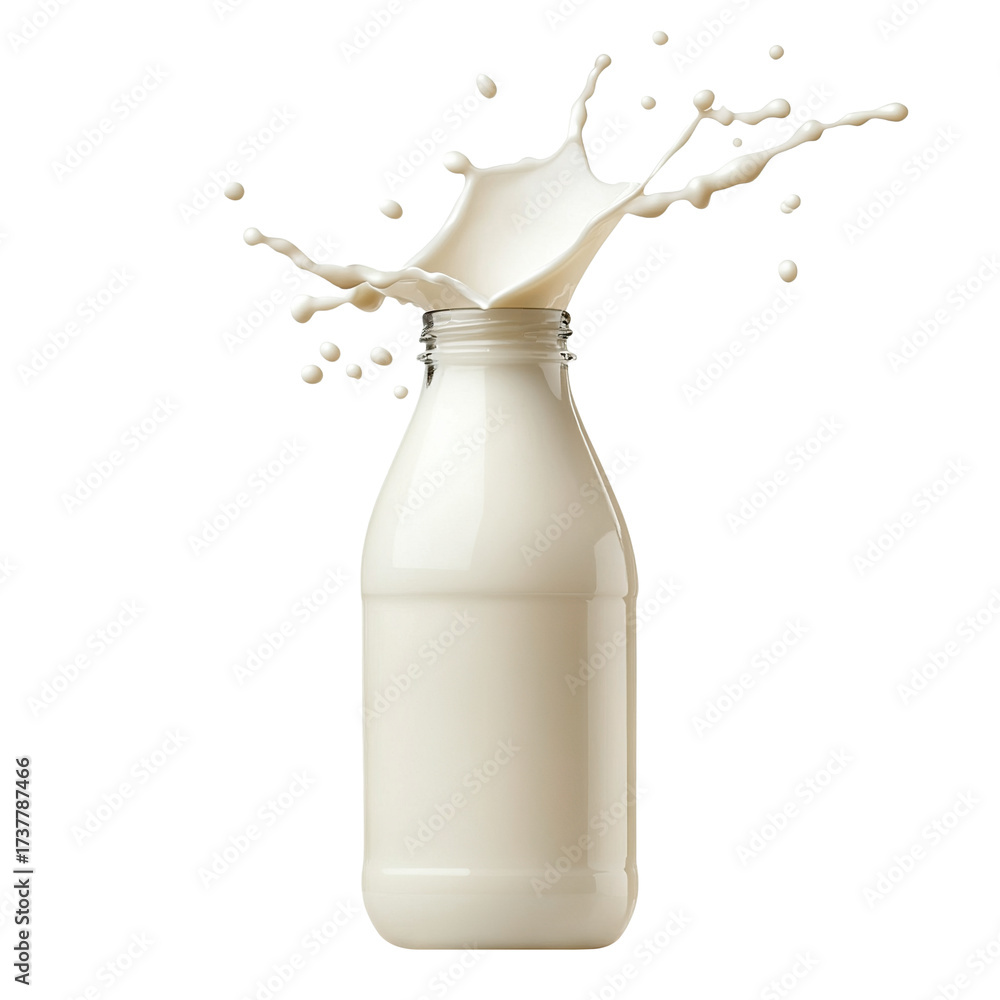Milk bottle with milk splash, isolated on transparent cutout background #1737787466