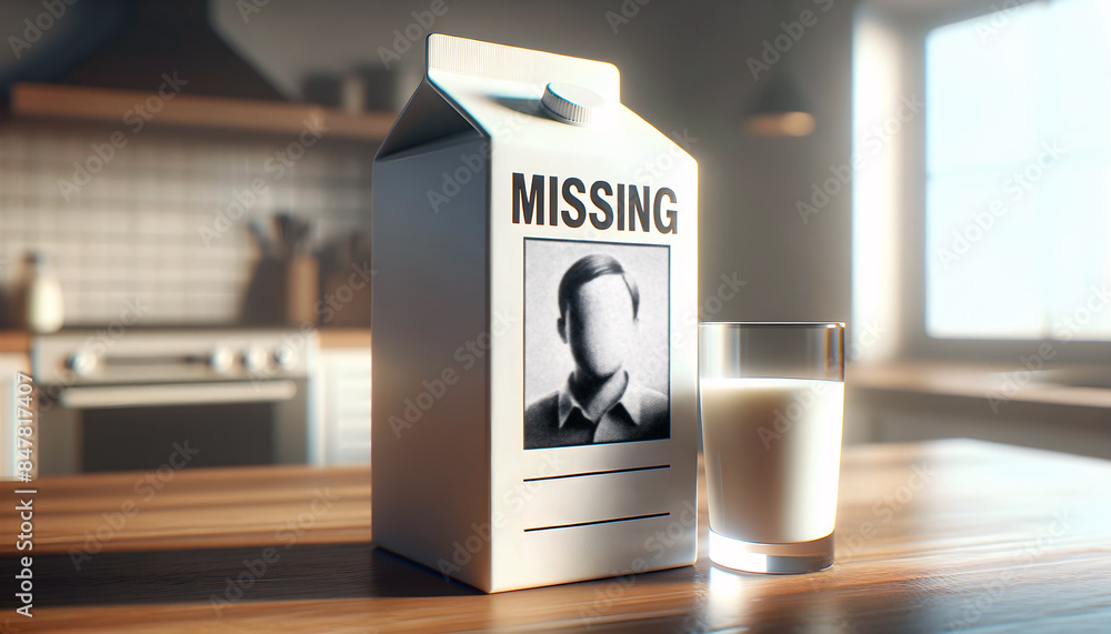 Milk carton with missing person notice on kitchen bench. Room for inserting face. #847817407