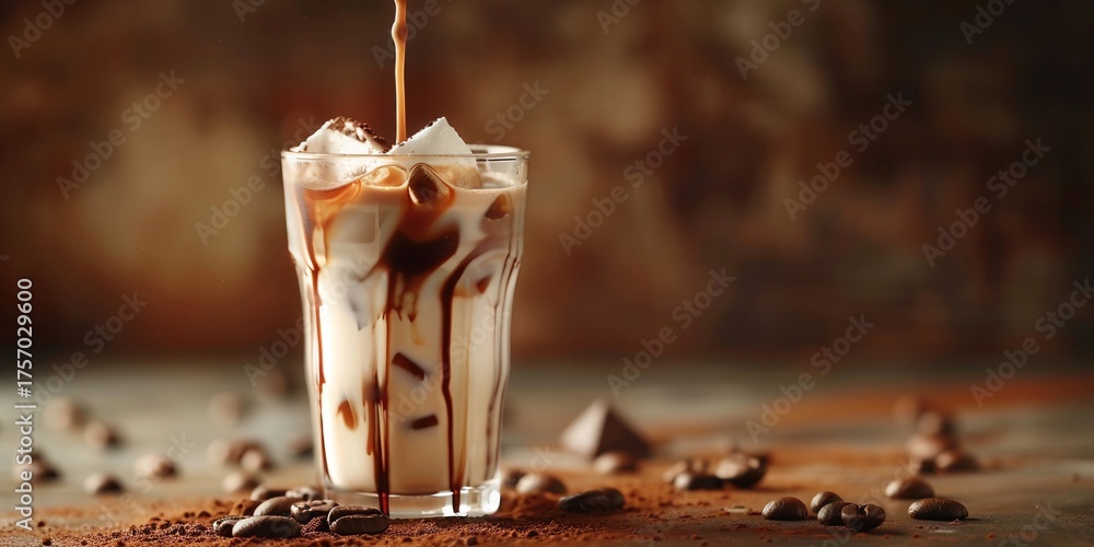 Milk pouring into a coffee cup with ice mocha latte syrup glass on a table copy space banner. Rustic dark background cafe banner with splashes, drops. #1757029600