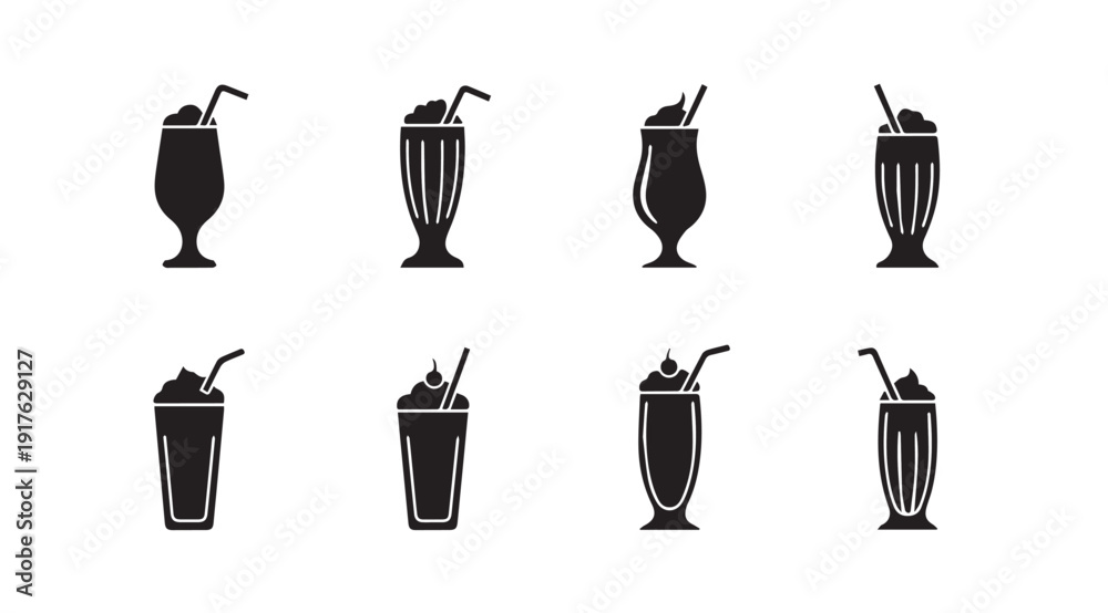 Milkshake Drink Icons Collection, Various Glass Styles, Black and White, Stock Media #1917629127