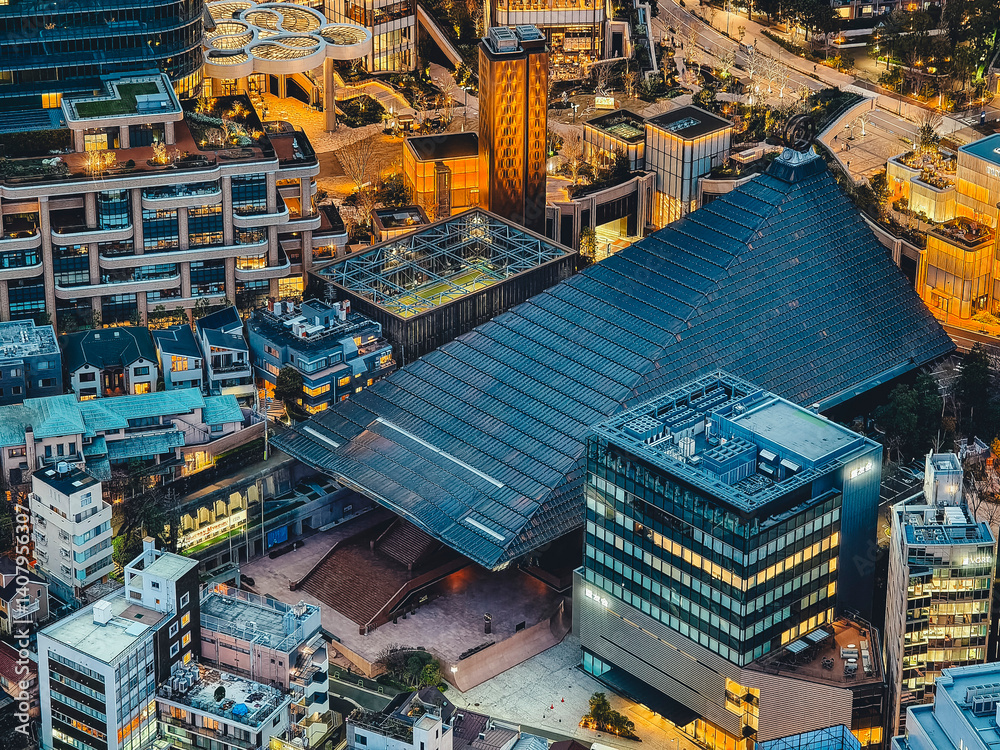 Minato, Tokyo, Japan - Reiyukai Shakaden Temple seen at night from above, surrounded by glowing urban architecture in Azabudai Hills #1407956307
