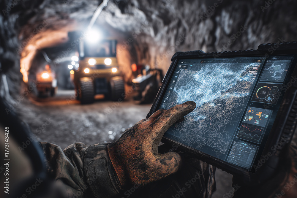 Miner Interacting With 3D Connectivity Map In Deep Underground Tunnel, Rugged Tablet, Autonomous Rover Relays, Industrial Communications, Private Networks, Remote Operations #1773143426