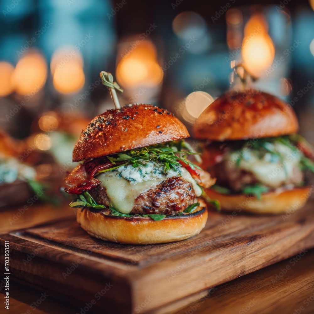 Mini gourmet cheeseburgers with bacon and greens #1703931511