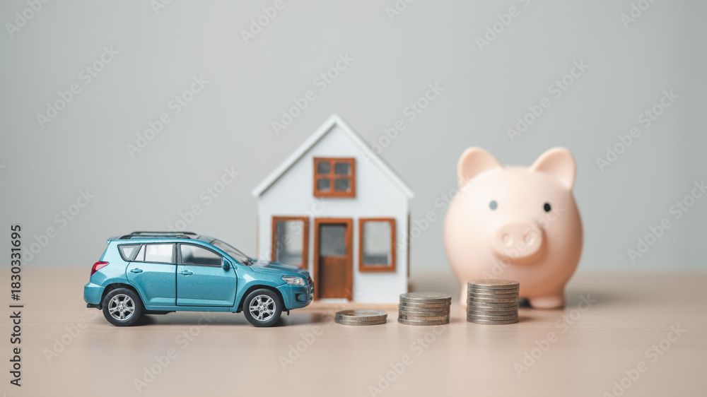 Miniature car, house model, stacked coins, and a piggy bank symbolizing personal finance, savings, asset management, investment planning, and long-term financial security. #1830331695