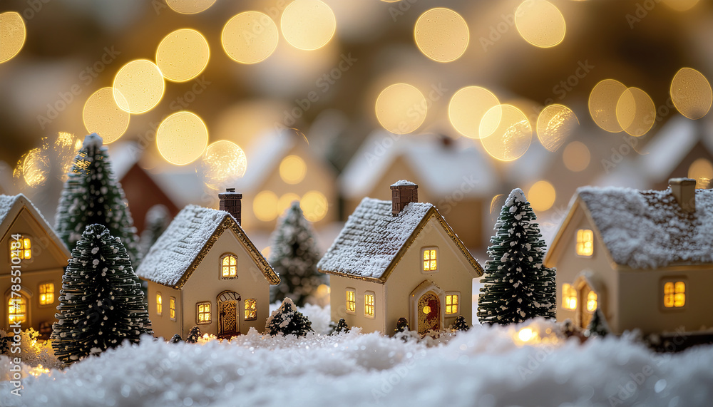 Miniature Christmas village with snow covered rooftops and warm glowing lights #1785510484
