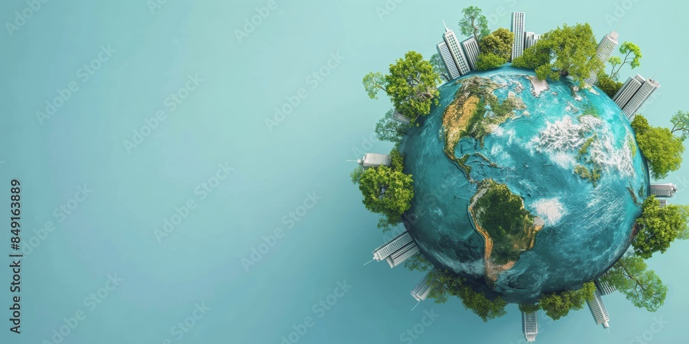 Miniature Earth with green landscapes and skyscrapers illustrating ecological concepts #849163889