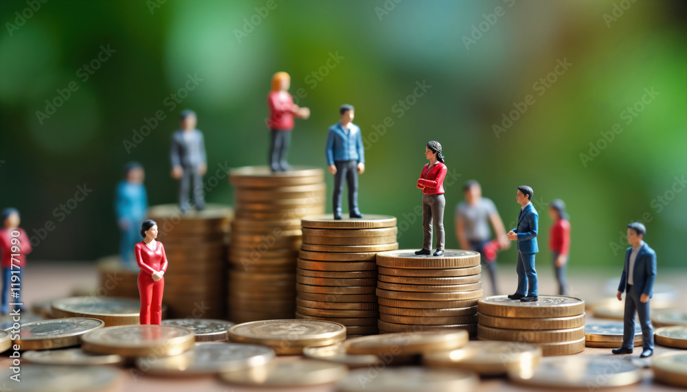 Miniature figures stand on stacks of coins social inequality. Different heights of coin stacks represent different financial situations. Unequal access to wealth, income shown. Concept of social #1191771990