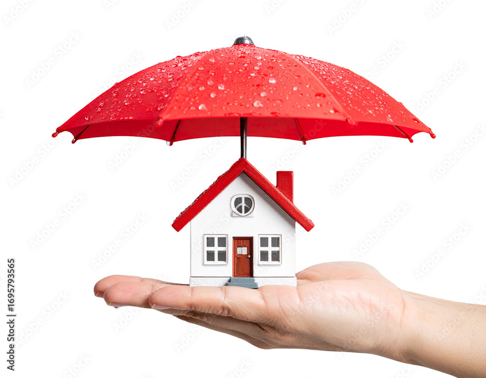 Miniature House Protected by Red Umbrella – Home Insurance Concept Flat Lay #1695793565