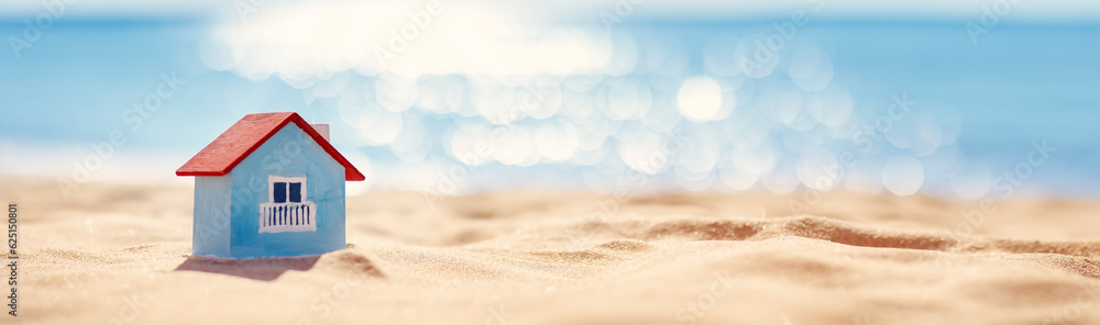 Miniature model of a house standing on the sand on the seacoast. #625150801