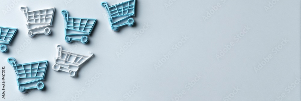 Miniature Shopping Carts in Various Colors Arranged on a Light Gray Background Creating an Artistic Display That Highlights Consumerism and Shopping Culture #1746701552
