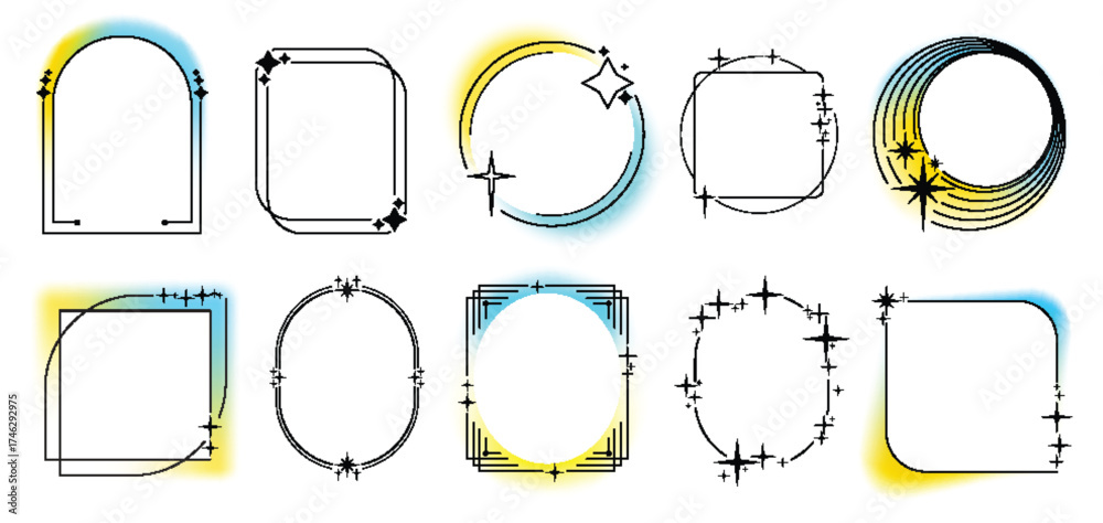 Minimal border frames with blur aura effects and sparkles for design layouts or social media templates. Geometric outlines with yellow and blue gradient. Decorative elements for retro posters. #1746292975