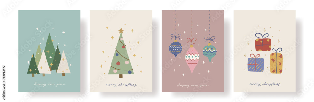 Minimal Christmas card set with modern geometric trees, baubles, and gift boxes in muted pastel colors. Simple winter holiday greeting design with elegant clean vector illustration for New Year #1789933797