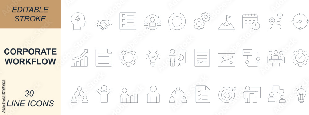 Minimal corporate workflow icon set with teamwork, strategy, planning, milestone, leadership, and success symbols. Editable for easy customization. Perfect for business, office, UI, web, app projects. #1746716621