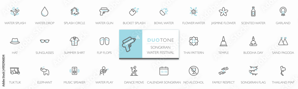 Minimal duotone Songkran and Water Festival icon set with modern flat line style. Editable stroke vector icons featuring Thai culture, water play, summer elements, and New Year celebration. vector ill #1912906834