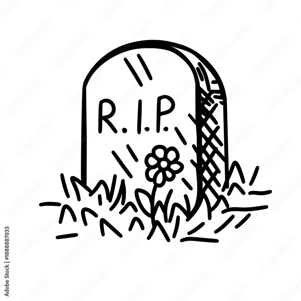 Minimal hand drawn illustration of a tombstone surrounded by grass and a daisy flower. Black and white sketch style vector artwork representing memory, loss, ending, farewell and remembrance. #1888887033
